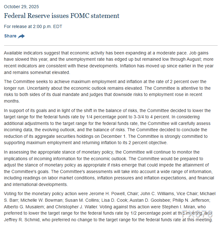 为支持其目标并考虑到风险平衡的变化,委员会决定将联邦基金利率目标区间下调25个基点至3.75%-4%。在考虑对联邦基金利率目标区间的进一步调整时,委员会将仔细评估新公布的数据、不断变化的前景和风险平衡。委员会还决定将其证券总持有量的缩减操作于12月1日结束。委员会坚决致力于支持充分就业并使通胀回到2%的目标。